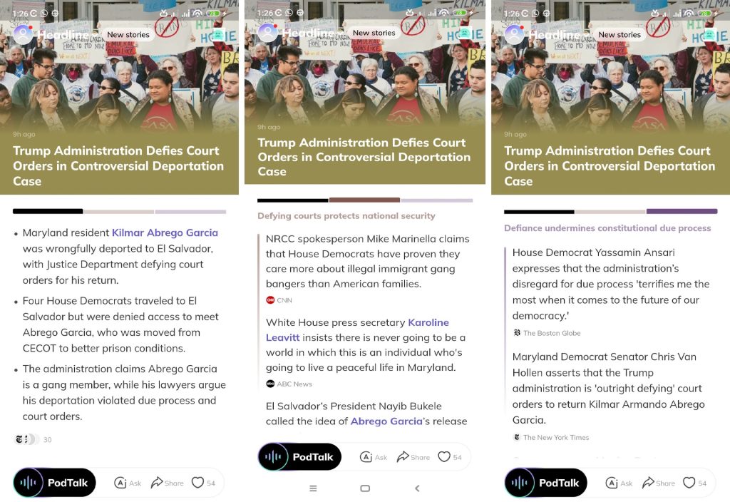 I was checking out some screenshots where they showed this feature in action with this deportation case about some guy named Kilmar Abrego Garcia. On the left side, you get the basic facts from one source, and on the right, you see how different outlets frame the exact same story. The Boston Globe was all about constitutional concerns with some quote from Rep. Yassamin Ansari talking about threats to democracy, while The New York Times focused more on Senator Chris Van Hollen saying the Trump administration is basically just ignoring court orders.
