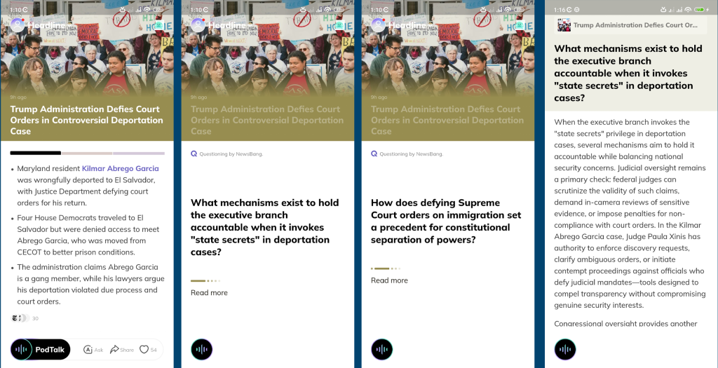 The app comes up with some pretty deep questions like “What mechanisms exist to hold the executive branch accountable when it invokes ‘state secrets’ in deportation cases?” and “How does defying Supreme Court orders on immigration set a precedent for constitutional separation of powers?” These aren’t just basic questions – they actually make you think about the bigger picture.